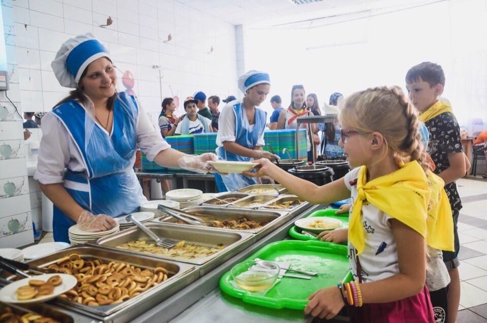 5-ти разовое питание - шведский стол (завтрак, обед, полдник, ужин, второй ужин). Сбалансированное меню разработано с учетом особенностей детского организма. В рационе ежедневно свежие овощи и фрукты.