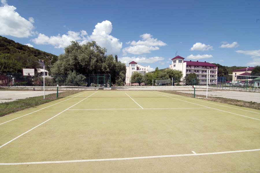- 2 волейбольные площадки (18 х 9м, тартановое покрытие / 18 х 9м, иск. трава);
