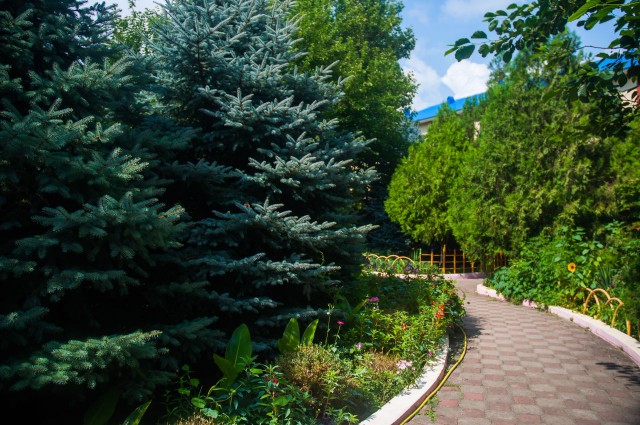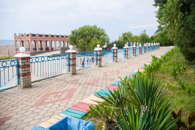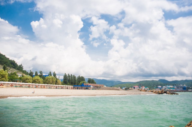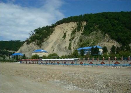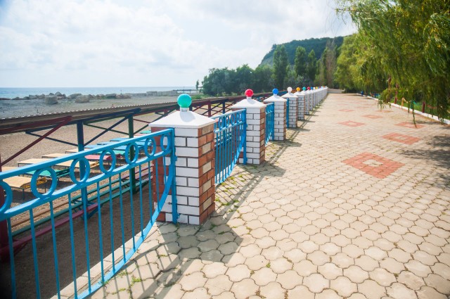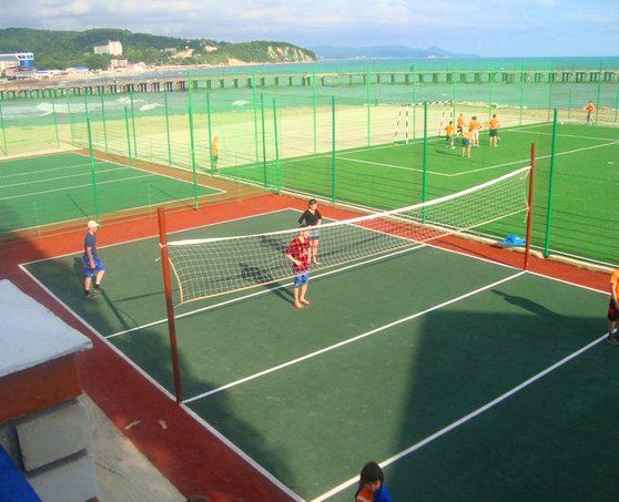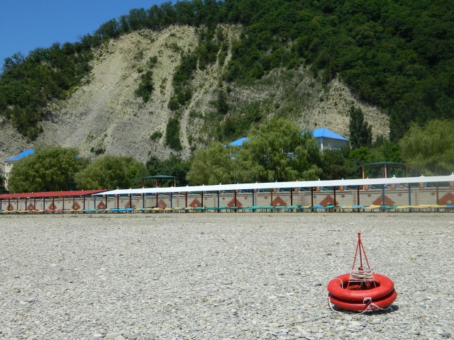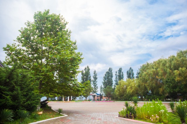 В 30 метрах от корпусов расположен собственный благоустроенный, комфортный галечный пляж, который содержится в безупречной чистоте. Купания происходят под присмотром взрослых, на пляже работает спасательная служба. Спуск к морю пологий и неглубокий, места для купания огорожены буйками. На пляже есть вся необходимая инфраструктура – теневые беседки, шезлонги, кабинки для переодеваний. Рядом с пляжем построен открытый наполняемый бассейн.