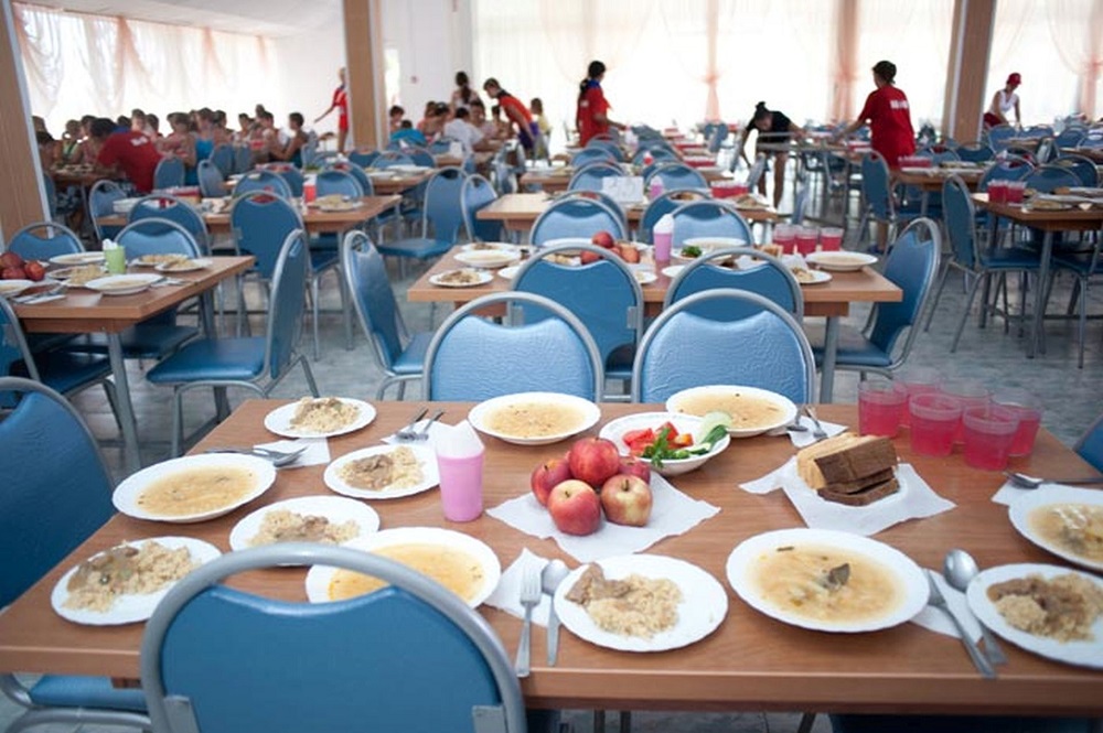 5-разовое: завтрак, обед, ужин, полдник, сонник. Питание качественное с обилием овощей, фруктов и соков. Организовано и диетическое питание. Есть кондитерский цех. Оборудовано место для мытья рук: 40 рукомойников и 20 электрополотенец.