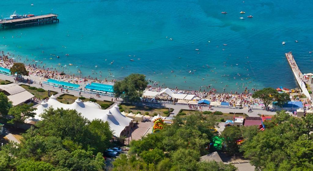 Собственный мелкогалечный пляж, расположен в 25 метрах от лагеря. Первая береговая линия. Пляж оборудован тентами, кабинками для переодевания, санузлами, медицинским пунктом и спасательным постом. Купание детей контролируют медицинский работник и спасатели.