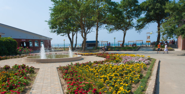 Мелкогалечный пляж площадью 8 000 метров в 50 метрах от корпусов. Пляж оборудован солнцезащитными навесами и раздевалками. За безопасность детей на пляже отвечают спасатели и плаврук. В течении дня на пляже в мед пункте дежурит медсестра.