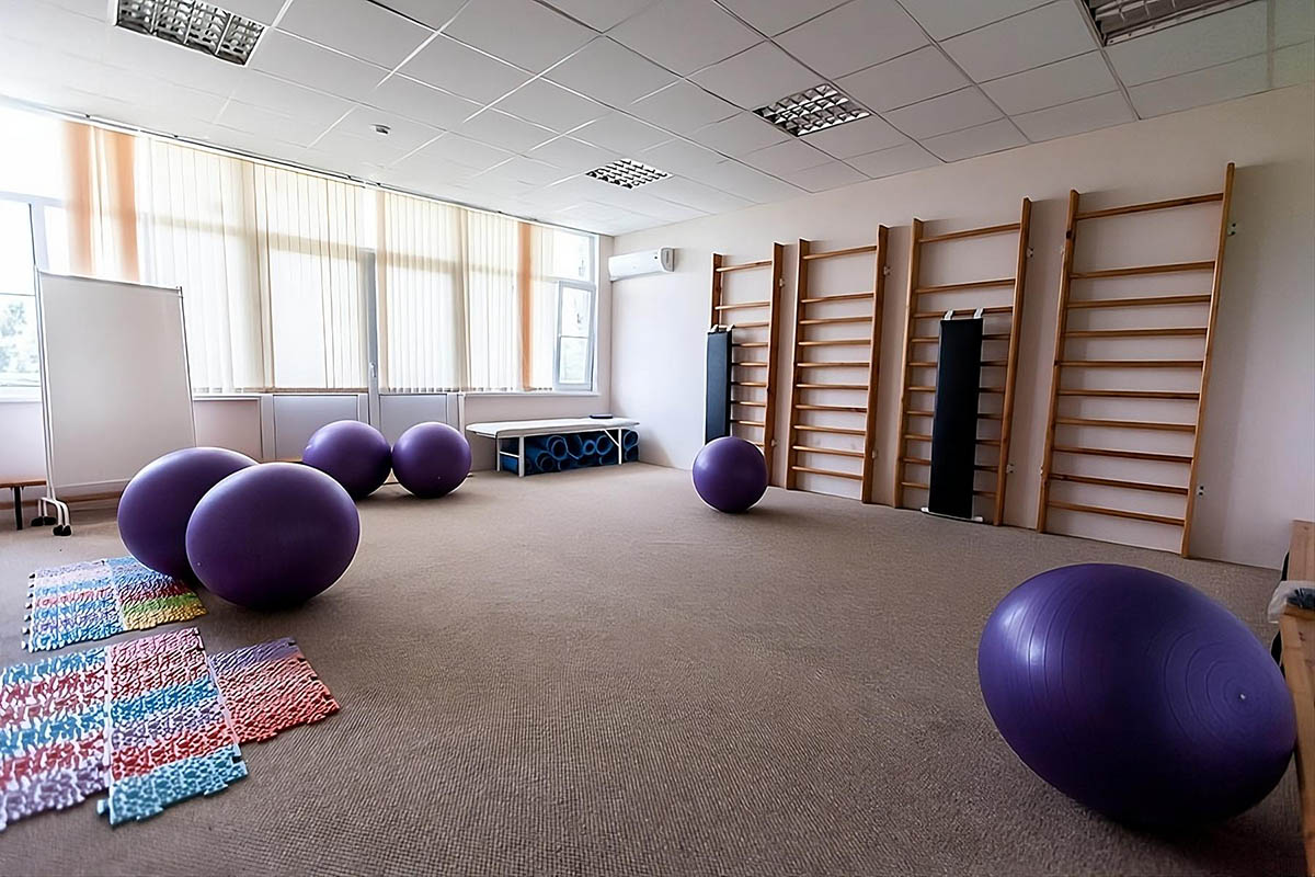 - зал для занятий ЛФК (6,5 х 6,15 м) оборудован зеркальными стенами, шведскими стенками, гимнастическими лавками, упорами и инвентарём (60 кв.м.);