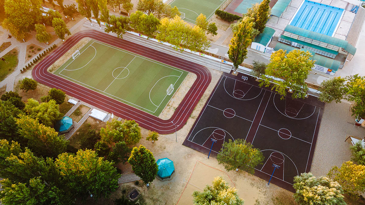 - 4 баскетбольные площадки (16 м х 14 м, резиновое покрытие);