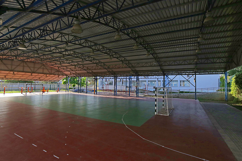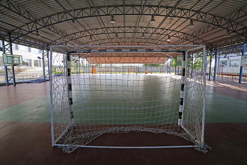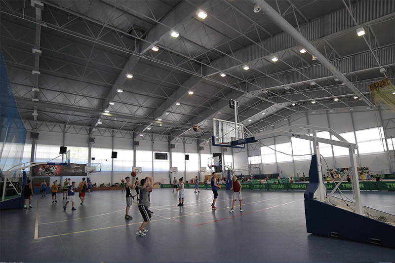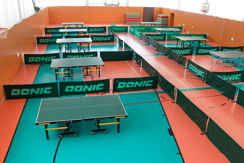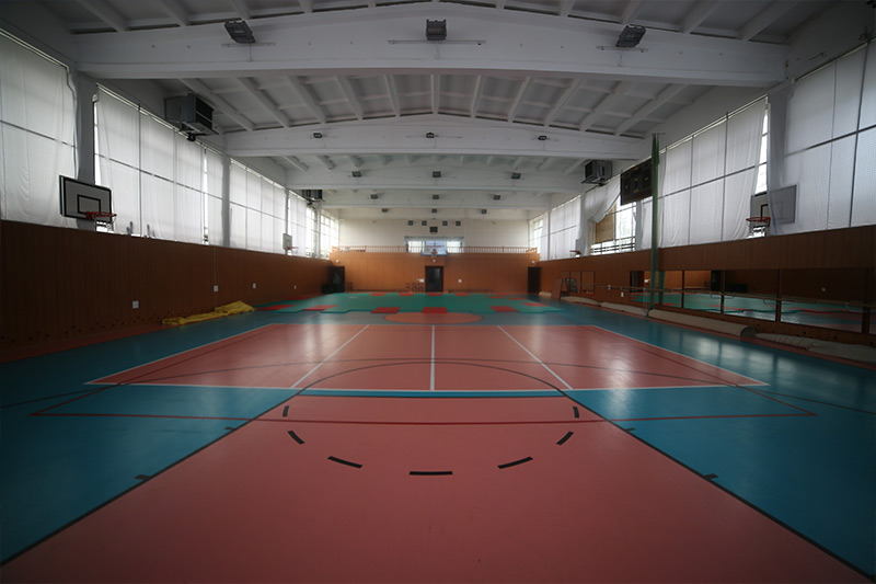 - спортивный зал 48х43 (высота 14м, гомогенный линолеум linotop sport, татами, ковры для гимнастики, боксерские груши, столы для настольного тенниса, передвижные фермы для баскетбола, стационарные щиты)