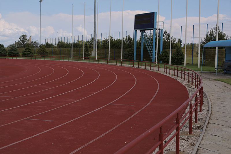 - международный стадион 105х70 (натуральный газон, табло, трибуны, 8 беговых дорожек с покрытием regupol, 2 сектора для прыжков в длину, 2 сектора для прыжков с шестом, сектор для прыжков в высоту)