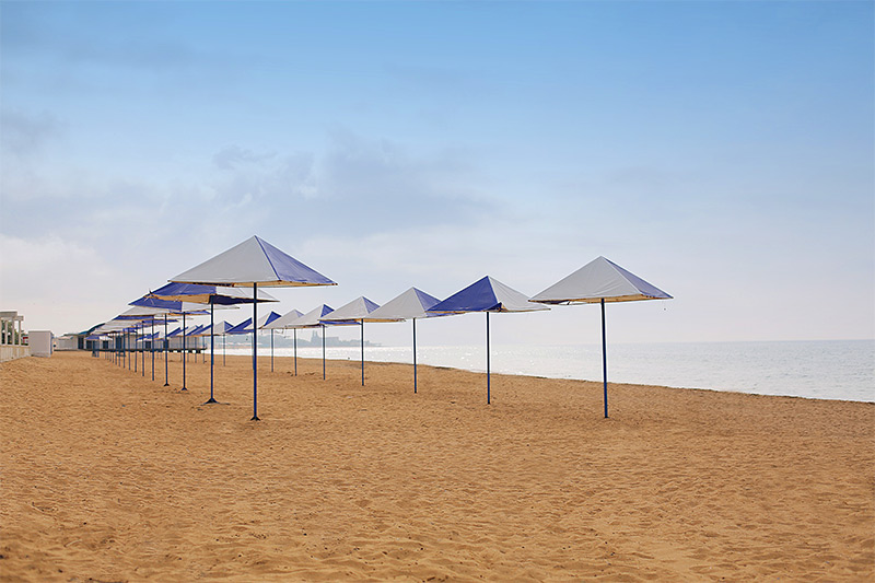 Просторный песчаный пляж протяженностью 1 км имеет пологий вход в море. Пляж оборудован душами, раздевалками. Работает спасательная станция.